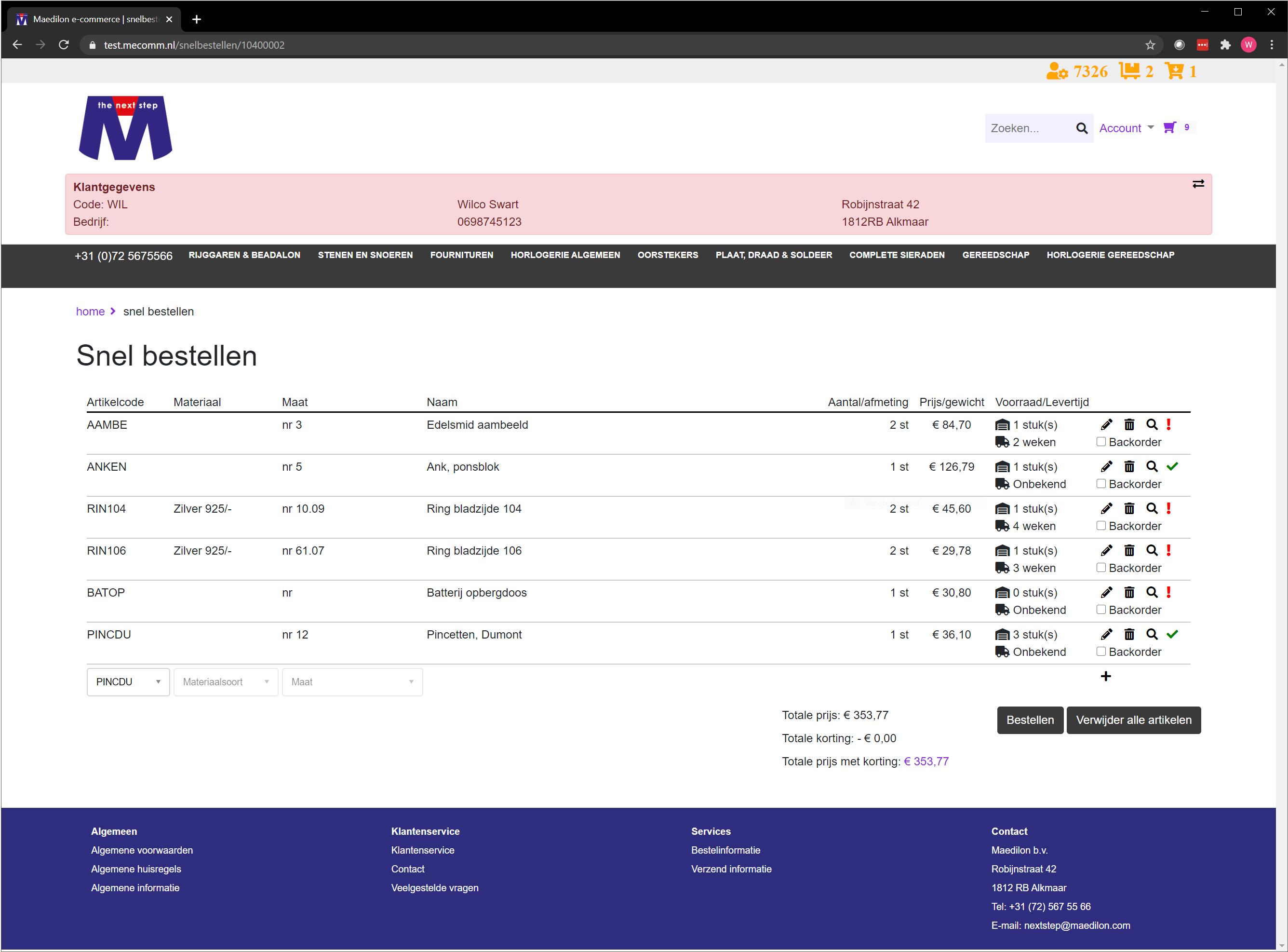 Uw klanten plaatsen doorgaans zelf op eenvoudige wijze hun bestelling op uw webshop. Maar voor klanten die specifieke vragen hebben of klanten die liever telefonisch bestellen is de oplossing voorzien van een snelbestellen functie voor uw medewerkers. Hiermee kunnen zeer efficient de gewenste artikelen in het winkelmandje geplaatst worden. Ook is in deze module handige informatie beschikbaar over voorraden en levertijden zodat u uw klant direct kunt adviseren.